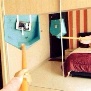 Nah kalau yang ini lain lagi. Mungkin idenya muncul saat sedang membersihkan kamar tidur. Keinginan untuk mengabadikan momen ketika bersih-bersih membuat orang ini menciptakan tongsis terbaru dari sebuah pengki/ Sekop.